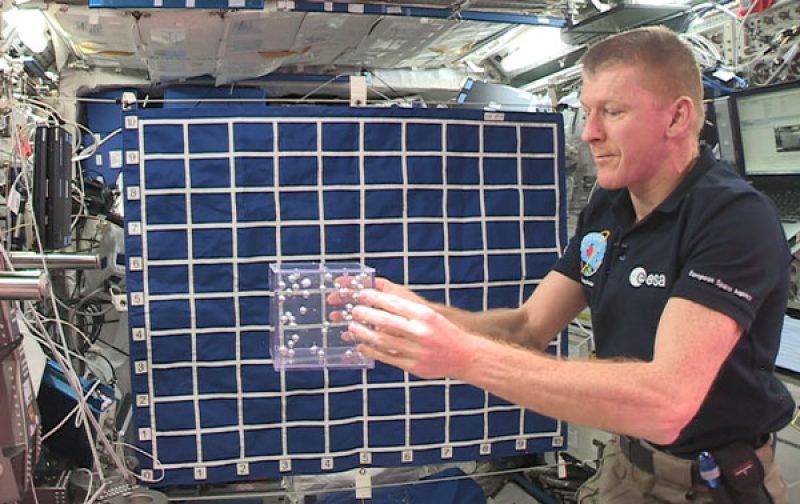 On-orbit demonstrations of two masses oscillating attached to a spring, and a clear box containing plastic beads to represent particles.